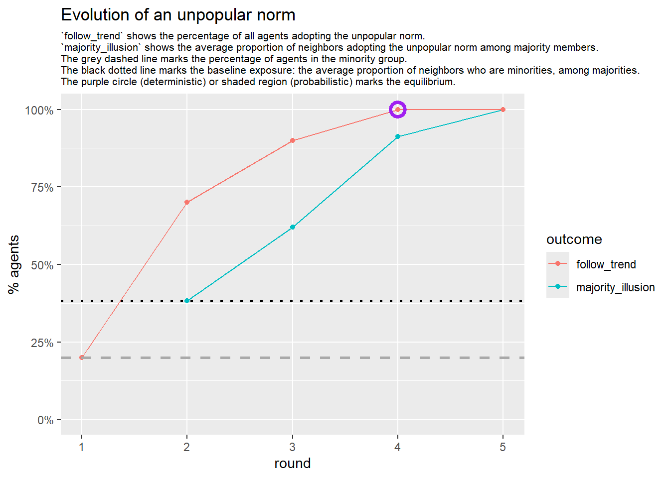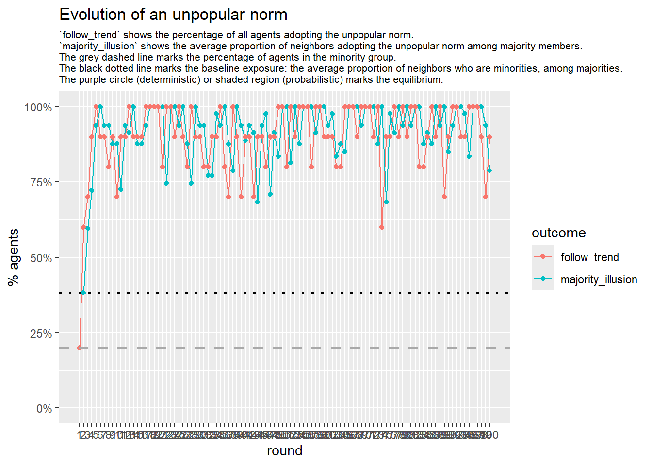 LS0tDQp0aXRsZTogIkV4cGVyaW1lbnQiDQpiaWJsaW9ncmFwaHk6IHJlZmVyZW5jZXMuYmliDQpsaW5rLWNpdGF0aW9uczogdHJ1ZQ0KZGF0ZTogIkxhc3QgY29tcGlsZWQgb24gYHIgZm9ybWF0KFN5cy50aW1lKCksICclZC0lbS0lWScpYCINCm91dHB1dDogDQogIGh0bWxfZG9jdW1lbnQ6DQogICAgc2VsZl9jb250YWluZWQ6IHRydWUNCiAgICBjc3M6IHR3ZWFrcy5jc3MNCiAgICB0b2M6IHRydWUNCiAgICB0b2NfZmxvYXQ6IHRydWUNCiAgICBudW1iZXJfc2VjdGlvbnM6IHRydWUNCiAgICB0b2NfZGVwdGg6IDQNCiAgICBjb2RlX2ZvbGRpbmc6IHNob3cNCiAgICBjb2RlX2Rvd25sb2FkOiB5ZXMNCi0tLQ0KDQpgYGB7ciwgZ2xvYmFsc2V0dGluZ3MsIGVjaG89RkFMU0UsIHdhcm5pbmc9RkFMU0UsIHJlc3VsdHM9J2hpZGUnLCBtZXNzYWdlPUZBTFNFfQ0KbGlicmFyeShrbml0cikNCmxpYnJhcnkodGlkeXZlcnNlKQ0Ka25pdHI6Om9wdHNfY2h1bmskc2V0KGVjaG8gPSBUUlVFKQ0Kb3B0c19jaHVuayRzZXQodGlkeS5vcHRzPWxpc3Qod2lkdGguY3V0b2ZmPTEwMCksdGlkeT1UUlVFLCB3YXJuaW5nID0gRkFMU0UsIG1lc3NhZ2UgPSBGQUxTRSxjb21tZW50ID0gIiM+IiwgY2FjaGU9VFJVRSwgY2xhc3Muc291cmNlPWMoInRlc3QiKSwgY2xhc3Mub3V0cHV0PWMoInRlc3QzIikpDQpvcHRpb25zKHdpZHRoID0gMTAwKQ0KcmdsOjpzZXR1cEtuaXRyKCkNCg0KY29sb3JpemUgPC0gZnVuY3Rpb24oeCwgY29sb3IpIHtzcHJpbnRmKCI8c3BhbiBzdHlsZT0nY29sb3I6ICVzOyc+JXM8L3NwYW4+IiwgY29sb3IsIHgpIH0NCmBgYA0KDQpgYGB7ciBrbGlwcHksIGVjaG89RkFMU0UsIGluY2x1ZGU9VFJVRX0NCmtsaXBweTo6a2xpcHB5KHBvc2l0aW9uID0gYygndG9wJywgJ3JpZ2h0JykpDQoja2xpcHB5OjprbGlwcHkoY29sb3IgPSAnZGFya3JlZCcpDQoja2xpcHB5OjprbGlwcHkodG9vbHRpcF9tZXNzYWdlID0gJ0NsaWNrIHRvIGNvcHknLCB0b29sdGlwX3N1Y2Nlc3MgPSAnRG9uZScpDQpgYGANCg0KLS0tDQoNCiMgR2V0dGluZyBzdGFydGVkDQoNClRvIGNvcHkgdGhlIGNvZGUsIGNsaWNrIHRoZSBidXR0b24gaW4gdGhlIHVwcGVyIHJpZ2h0IGNvcm5lciBvZiB0aGUgY29kZS1jaHVua3MuDQoNCiMjIGNsZWFuIHVwDQoNCmBgYHtyLCBjbGVhbl91cCwgcmVzdWx0cz0naGlkZSd9DQpybShsaXN0PWxzKCkpDQpnYygpDQpgYGANCg0KPGJyPg0KDQojIyBjdXN0b20gZnVuY3Rpb25zDQoNCldlIGRlZmluZWQgYSBudW1iZXIgY3VzdG9tIGZ1bmN0aW9ucywgYXQgYHIgeGZ1bjo6ZW1iZWRfZmlsZSgiLi9jdXN0b21fZnVuY3Rpb25zLlIiKWAuDQoNCmBgYHtyLCBjdXN0b21fZnVuY3Rpb25zfQ0Kc291cmNlKCIuL2N1c3RvbV9mdW5jdGlvbnMuUiIpDQpgYGANCg0KPGJyPg0KDQojIyBuZWNlc3NhcnkgcGFja2FnZXMNCg0KLSBgdGlkeXZlcnNlYDogZGF0YSB3cmFuZ2xpbmcNCi0gYGlncmFwaGA6IGdlbmVyYXRlIGFuZCB2aXN1YWxpemUgZ3JhcGhzDQotIGBwYXJhbGxlbGA6IHBhcmFsbGVsIGNvbXB1dGluZyB0byBzcGVlZCB1cCBzaW11bGF0aW9uDQotIGBmb3JlYWNoYDogbG9vcGluZyBpbiBwYXJhbGxlbA0KLSBgZG9QYXJhbGxlbGA6IHBhcmFsbGVsIGJhY2tlbmQgZm9yIGBmb3JlYWNoYA0KLSBgZ2dwbG90MmA6IGRhdGEgdmlzdWFsaXphdGlvbg0KLSBgZ2doNHhgOiBoYWNrcyBmb3IgYGdncGxvdDJgDQotIGBnZ3B1YnJgOiBtYWtlIHZpc3VhbGl6YXRpb25zIHB1YmxpY2F0aW9uLXJlYWR5DQoNCmBgYHtyLCBwYWNrYWdlc30NCnBhY2thZ2VzID0gYygidGlkeXZlcnNlIiwgImlncmFwaCIsICJnZ3Bsb3QyIiwgInBhcmFsbGVsIiwgImRvUGFyYWxsZWwiLCAiZm9yZWFjaCIsICJnZ2g0eCIsICJnZ3B1YnIiLCAicGxvdGx5IiwgIlJDb2xvckJyZXdlciIsICJncmlkIiwgImdyaWRFeHRyYSIsICJwYXRjaHdvcmsiLCAiZ2dwbG90aWZ5IiwgImdncmFwaCIsICJnZ2FuaW1hdGUiLCAiUkNvbG9yQnJld2VyIiwNCiAgICAiZ2d0ZXh0IiwgIm1hZ2ljayIsICJqc29ubGl0ZSIpDQoNCmludmlzaWJsZShmcGFja2FnZS5jaGVjayhwYWNrYWdlcykpDQpybShwYWNrYWdlcykNCmBgYA0KDQotLS0NCg0KIyBFeHBlcmltZW50YWwgY29uZGl0aW9ucw0KDQoNCmBgYHtyLCBlY2hvPVRSVUUsIGZpZy5zaG93PSdob2xkJywgZmlnLmtlZXA9J2FsbCcsIG1lc3NhZ2U9RkFMU0UsIGZpZy5oZWlnaHQ9NX0NCiMgcGljayBvbmUgY29uZmlndXJhdGlvbiB0aGF0IGxpa2VseSBsZWFkcyB0byBhbiB1bnBvcHVsYXIgbm9ybSwgYW5kIGV4cGxvcmUgbXVsdGlwbGUgJ3NlZWRzJzoNCnJ1bl9vbmVfc2VlZCA8LSBmdW5jdGlvbigNCiAgaSwNCiAgYmFzZV9zZWVkID0gMTI1MzI4MTEyMywNCiAgcGFyYW1zID0gbGlzdChzID0gMTUsIGUgPSAxMCwgdyA9IDQwLCB6ID0gNTAsIGxhbWJkYTEgPSA1LCBsYW1iZGEyID0gMS44KSwNCiAgDQogICMgdHdlYWsgbmV0d29yaw0KICBrX21pbiA9IDIsIA0KICBrX21heCA9IDksDQogIGFscGhhID0gMi4xLA0KICByaG8gPSAwLjQsDQogIHIgPSAtMC4xLA0KICANCiAgIyByZXRyaWV2ZSBuZXR3b3JrDQogIHJldHVybl9uZXR3b3JrID0gRkFMU0UNCiAgDQopIHsNCiAgIyBkZXJpdmVkIHNlZWQgZm9yIHRoaXMgcnVuDQogIHNlZWRfaSA8LSBiYXNlX3NlZWQgKyBpDQogIHNldC5zZWVkKHNlZWRfaSkNCg0KICAjIC0tLSBuZXR3b3JrIGNyZWF0aW9uIC0tLQ0KICBkZWdzZXEgPC0gZmRlZ3NlcSgNCiAgICBuICAgICAgPSAxMCwNCiAgICBhbHBoYSAgPSBhbHBoYSwNCiAgICBrX21pbiAgPSBrX21pbiwNCiAgICBrX21heCAgPSBrX21heCwNCiAgICBkaXN0ICAgPSAibG9nLW5vcm1hbCIsICN1c2UgbG9nLW5vcm1hbCANCiAgICBzZWVkICAgPSBzZWVkX2kNCiAgKQ0KDQogIG5ldHdvcmsgPC0gc2FtcGxlX2RlZ3NlcShkZWdzZXEsIG1ldGhvZCA9ICJ2bCIpDQogIA0KICBWKG5ldHdvcmspJHJvbGUgPC0gc2FtcGxlKA0KICAgIGMocmVwKCJ0cmVuZHNldHRlciIsIDIpLCByZXAoImNvbmZvcm1pc3QiLCA4KSkNCiAgKQ0KICANCg0KICByZXdpcmVkX25ldHdvcmsgPC0gZnJld2lyZV9yKG5ldHdvcmssIHIsIHZlcmJvc2UgPSBGQUxTRSwgbWF4X2l0ZXIgPSAxZTUpDQogIGZpbmFsX25ldHdvcmsgICA8LSBmc3dhcF9yaG8ocmV3aXJlZF9uZXR3b3JrLCByaG8sIHZlcmJvc2UgPSBGQUxTRSwgbWF4X2l0ZXIgPSAxZTQpDQogIA0KICAjIC0tLSBzdGF0cyAtLS0NCiAgc3RhdHMgPC0gbGlzdCgNCiAgICBydW4gICAgICAgICAgID0gaSwNCiAgICBzZWVkICAgICAgICAgID0gc2VlZF9pLA0KICAgIG51bV9ub2RlcyAgICAgPSB2Y291bnQoZmluYWxfbmV0d29yayksDQogICAgbnVtX2VkZ2VzICAgICA9IGVjb3VudChmaW5hbF9uZXR3b3JrKSwNCiAgICBhdmdfZGVncmVlICAgID0gbWVhbihkZWdyZWUoZmluYWxfbmV0d29yaykpLA0KICAgIHNkX2RlZ3JlZSAgICAgPSBzZChkZWdyZWUoZmluYWxfbmV0d29yaykpLA0KICAgIG5ldF9kZW5zaXR5ICAgPSBlZGdlX2RlbnNpdHkoZmluYWxfbmV0d29yayksDQogICAgbmV0X2RpYW1ldGVyICA9IGRpYW1ldGVyKGZpbmFsX25ldHdvcmssIGRpcmVjdGVkID0gRkFMU0UsIHVuY29ubmVjdGVkID0gVFJVRSksDQogICAgYXZnX3BhdGhfbGVuICA9IGF2ZXJhZ2UucGF0aC5sZW5ndGgoZmluYWxfbmV0d29yaywgZGlyZWN0ZWQgPSBGQUxTRSksDQogICAgY2x1c3RfY29lZmYgICA9IHRyYW5zaXRpdml0eShmaW5hbF9uZXR3b3JrLCB0eXBlID0gImdsb2JhbCIpLA0KICAgIGFzc29ydF9kZWcgICAgPSBhc3NvcnRhdGl2aXR5X2RlZ3JlZShmaW5hbF9uZXR3b3JrKSwNCiAgICBkZWdfdHJhaXRfY29yID0gZmRlZ3RyYWl0Y29yKGZpbmFsX25ldHdvcmspJGNvciwNCiAgICBjb21wb25lbnRzICAgID0gY29tcG9uZW50cyhmaW5hbF9uZXR3b3JrKSRubw0KICApDQogIA0KICBmcGxvdF9ncmFwaChmaW5hbF9uZXR3b3JrLCBsYXlvdXQgPSBsYXlvdXRfd2l0aF9mcihmaW5hbF9uZXR3b3JrKSkgDQogIA0KICANCiAgIyAtLS0gaW5pdGlhbCBhY3Rpb25zIC0tLQ0KICBWKGZpbmFsX25ldHdvcmspJGFjdGlvbiA8LSBpZmVsc2UoVihmaW5hbF9uZXR3b3JrKSRyb2xlID09ICJ0cmVuZHNldHRlciIsIDEsIDApDQogIA0KICAjIC0tLSBkZXRlcm1pbmlzdGljIHNpbXVsYXRpb24gLS0tDQogIHNpbV9kZXQgPC0gZmFibSgNCiAgICBuZXR3b3JrICAgICAgPSBmaW5hbF9uZXR3b3JrLA0KICAgIHBhcmFtcyAgICAgICA9IHBhcmFtcywNCiAgICBtYXhfcm91bmRzICAgPSA1MCwNCiAgICBtaV90aHJlc2hvbGQgPSAwLjQ5LA0KICAgIGNob2ljZV9ydWxlICA9ICJkZXRlcm1pbmlzdGljIiwNCiAgICBwbG90ICAgICAgICAgPSBUUlVFLA0KICAgIGhpc3RvcmllcyAgICA9IFRSVUUNCiAgKQ0KICANCiAgIyBnZW5lcmF0ZSB0aGUgZ2lmIGZvciB0aGUgY3VycmVudCBuZXR3b3JrDQogIGdpZl9maWxlbmFtZSA8LSBwYXN0ZTAoIi4vZmlndXJlcy9hbmltYXRpb25fbmV0d29ya18iLCBzZWVkX2ks